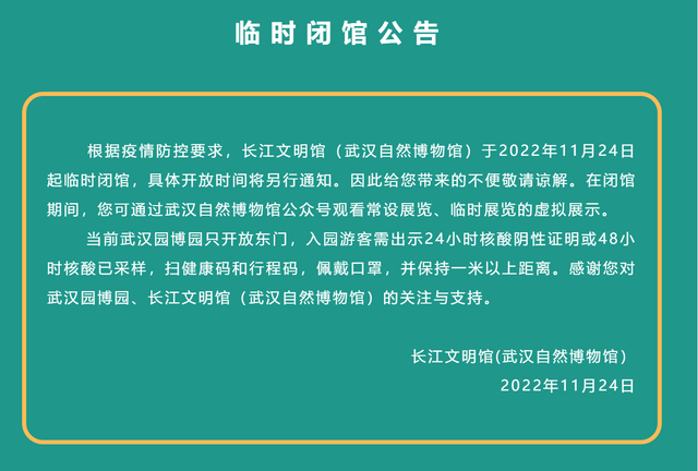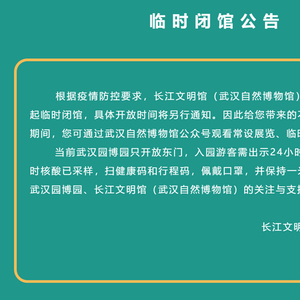 根据疫情防控要求,长江文明馆(武汉自然博物馆)于2022年11月24日起临时闭馆,具体开放时间将另行通知。因此给您带来的不便敬请谅解。在闭馆期间,您可通过武汉自然博物馆公众号观看常设展览、临时展览的虚拟展示。