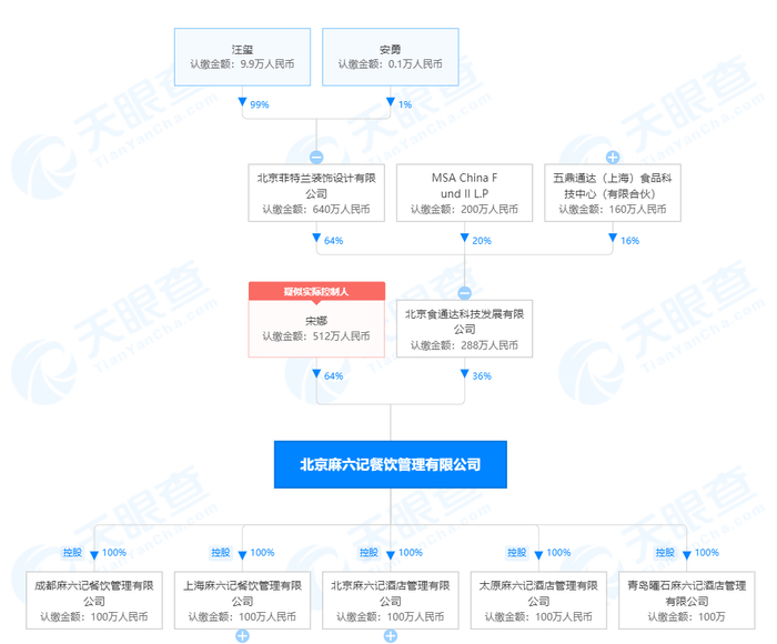知识产权信息显示,该公司已申请多个“麻六记”“小汪麻六记”等商标,商标状态多为等待实质审查。股权穿透图显示,该公司为北京食通达科技发展有限公司控股股东,后者则为北京麻六记餐饮管理有限公司、北京麻六记食品科技有限公司、北京麻六记食品销售有限公司等公司的股东。