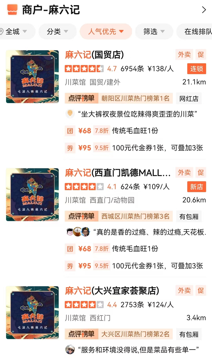 麻六记主打毛血旺、辣子鸡、水煮鱼等川菜产品。大众点评显示,如今麻六记在北京共有13家门店,麻六记客单价在100元上下。