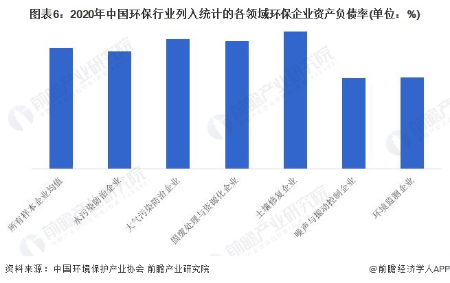 2020年,被调查企业资产负债率平均值为55.0%。其中,水污染防治、噪声与振动控制、环境监测领域企业资产负债率低于该平均值;而大气污染防治、固体废物处理处置与资源化、土壤修复领域企业的资产负债率则高于该平均值。