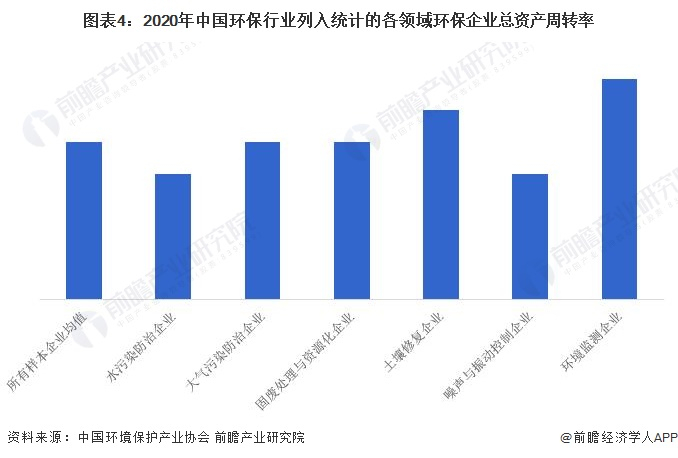 2020年,被调查企业总资产周转率平均值为0.5,说明上述企业的资产营运能力亟待提高。其中,土壤修复、环境监测领域企业的总资产周转率高于该平均值;大气污染防治、固体废物处理处置与资源化领域企业的总资产周转率与该平均值持平,而水污染防治、噪声与振动控制领域企业的总资产周转率则低于该平均值。