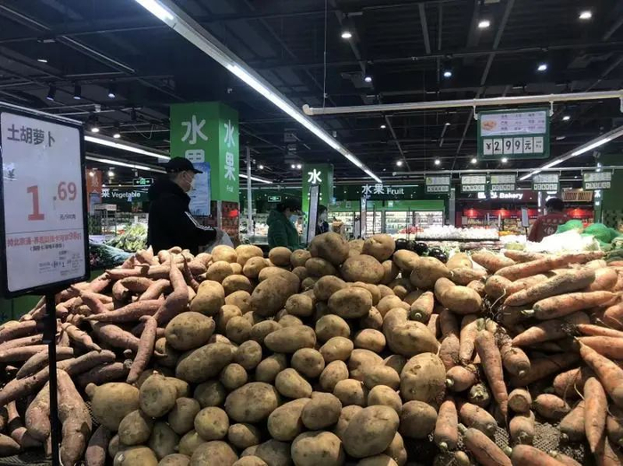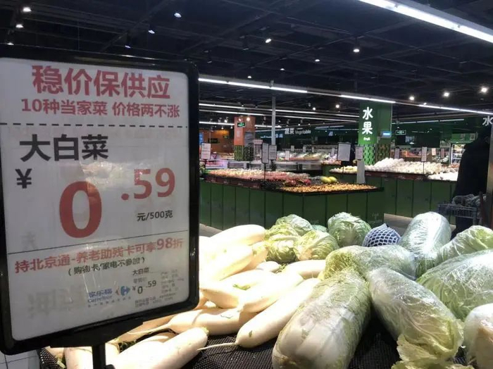除了货品充足,价格也相对稳定。北青报记者在家乐福超市注意到,大白菜、圆白菜、白萝卜等部分蔬菜的售价每斤不到1元。一些超市还承诺“当家菜价格两不涨”。