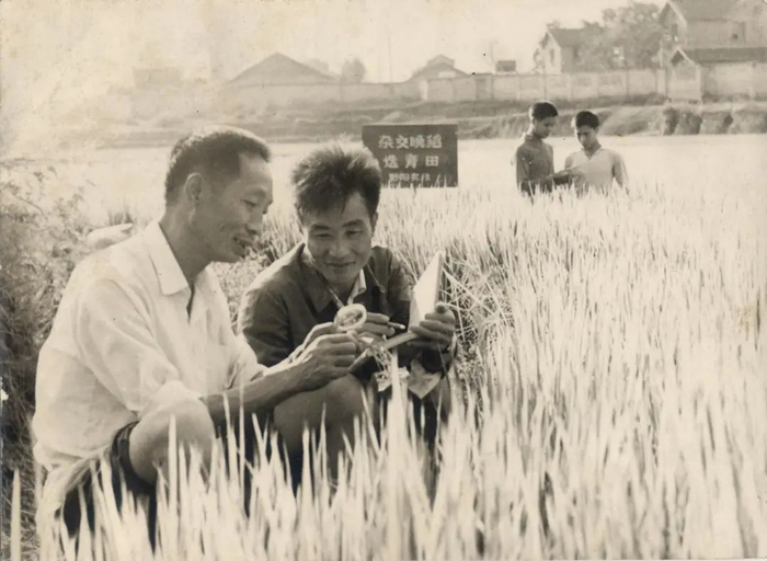 袁隆平与助手李必湖(左二)在安江农校试验田观察