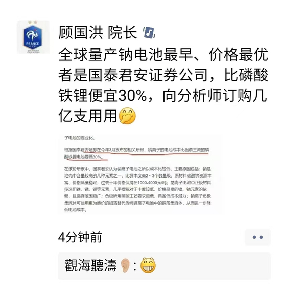 财通社获取的几张截图显示,吉林大学青岛汽车研究院副院长顾国洪发朋友圈称:全球量产钠电池最早、价格最优者是国泰君安证券公司,比磷酸铁锂便宜30%,向分析师订购几亿支用用。