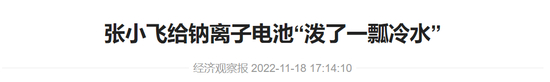 除了顾国洪、吴辉两位产业研究人士公开吐槽外,经济观察报近期的报道《张小飞给钠离子电池“泼了一瓢冷水”》(正是该报道引用了国泰君安3月的研报)也指出,在11月15日召开的2022高工锂电年会上,高工锂电董事长张小飞在开幕致辞中谈及钠离子电池时,给这一热门概念“泼了一瓢冷水”。