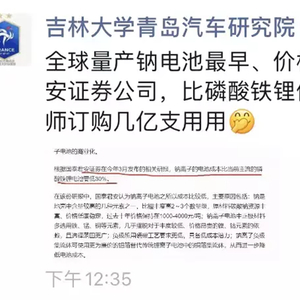 针对今日引发高度关注的朋友圈内容,吉林大学青岛汽车研究院副院长顾国洪向《科创板日报》记者解释称:“(钠电)原则上会便宜,但需要三、五年产业化后才能实现。不能单纯讲材料便宜了,东西就一定便宜,需要规模化生产。有好几个指标综合来衡量。”