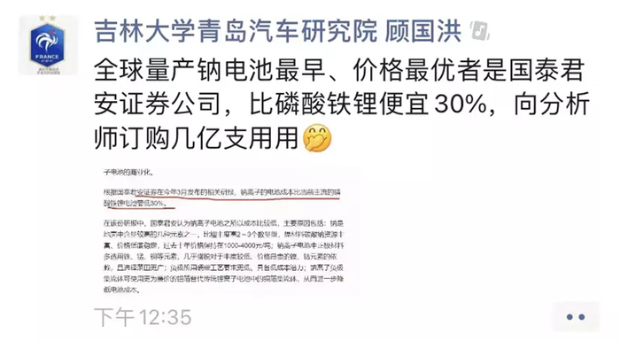 具体来看,吉林大学青岛汽车研究院副院长顾国洪在其微信朋友圈发文称:“全球量产钠电池最早、价格最优者是国泰君安证券公司,比磷酸铁锂便宜30%,向分析师订购几亿支用用。”同时,他引用了一张截图,该图片内容显示为:根据国泰君安证券在今年3月发布的相关研报,钠离子的电池成本比当前主流的磷酸铁锂电池要低30%。