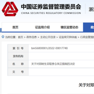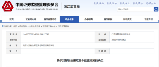 11月24日,浙江证监局公布《关于对郑树生采取责令改正措施的决定》。郑树生作为杭州迪普科技股份有限公司(300768)董事长、控股股东、实际控制人,在迪普科技2019年上市申请期间,作出《关于转让杭州宏杉科技股份有限公司股权的承诺函》,郑树生承诺在2021年12月31日前将持有的杭州宏杉科技股份有限公司股权转让给迪普科技或无关联的第三方,并在迪普科技《首次公开发行股票并在创业板上市招股说明书》中予以披露。迪普科技2020年9月10日临时股东大会豁免了郑树生向迪普科技转让宏杉科技股权的承诺履行。郑树生应当继续履行向无关联第三方转让所持宏杉科技股权等承诺事项。截至2022年10月31日,郑树生仍持有宏杉科技33.06%的股份,未能在2021年12月31日前向无关联第三方转让。上述行为构成了《上市公司监管指引第4号——上市公司实际控制人、股东、关联方、收购人以及上市公司承诺及履行》第五条和《上市公司监管指引第4号——上市公司及其相关方承诺》第十五条所述情形,浙江证监局决定对郑树生采取责令改正的监督管理措施。