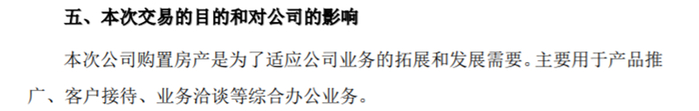 而金安国纪公告称:“公司此次购置上述房产,是为了适应业务拓展和发展需要,主要用于产品推广、客户接待、业务洽谈等综合办公业务。”