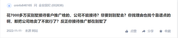 这显然无法令人信服。11月11日,上述投资者再次提出疑问:“花7000多万买别墅接待客户推广啥的,公司不能接待?非要到别墅去?你找理由也找个靠谱点的啊,那把公司地卖了不就行了?反正你接待推广都在别墅了。”