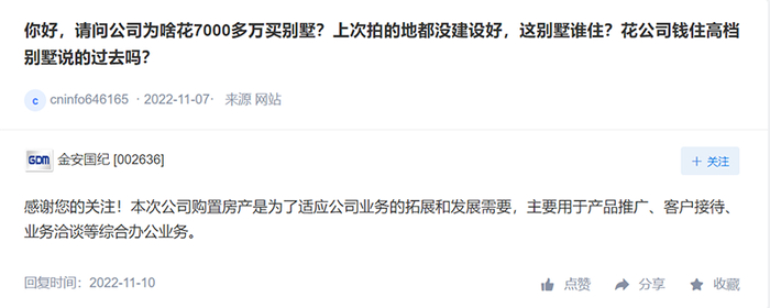 金安国纪公告买房办公后,随即引发投资者质疑。11月7日,一名投资者在互动平台向金安国纪提问:“请问公司为啥花7000多万买别墅?上次拍的地都没建设好,这别墅谁住?花公司钱住高档别墅说的过去吗?”