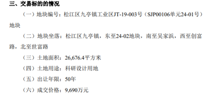 1月26日,金安国纪董事会通过议案,全资子公司上海金安国纪实业有限公司以自有资金9690万元,购买上海市松江区九亭镇工业区JT-19-003号(SJP00106单元24-01号)地块,土地面积26676.4平方米。