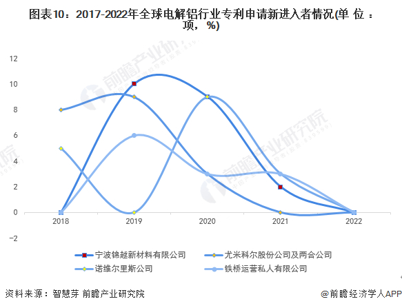 全球新进入者有四位,分别是宁波锦越新材料有限公司、尤米科尔股份公司及两合公司、诺维尔里斯公司与铁桥运营私人有限公司,2019年,宁波锦越有限公司申请的电解铝专利数量最多,为10项。