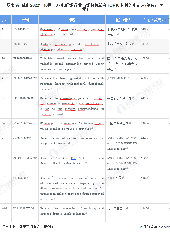 全球电解铝市场价值最高TOP10专利中,排名第一的专利是由冶联科技地产有限责任公司申请的,价值高达6480美元。