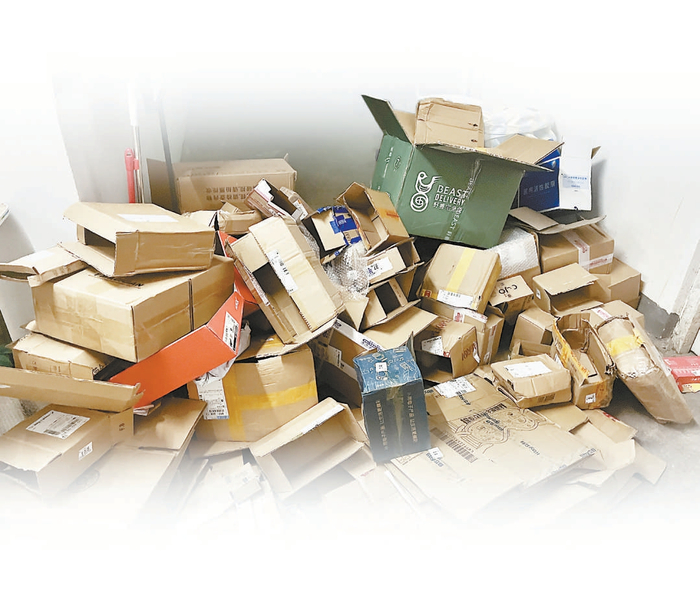 某小区快递站快递盒成堆,基本都没有撕去面单上的个人信息