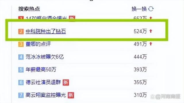 2019年10月,中科院在培育钻石领域取得科技突破,“中科院种出了钻石”迅速冲上了热搜榜第二,引发了众多媒体与网友的广泛关注,中科院通过改进钻石工艺,培育出纯净度更高的钻石,价格却只有原来的六分之一。该技术成功帮助河南企业打破了原有人造钻石“纯净度低”的老大难问题。
