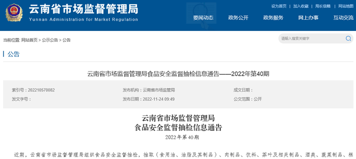 中国质量新闻网讯 2022年11月24日,云南省市场监督管理局网站发布食品安全监督抽检信息通告(2022年第40期)。