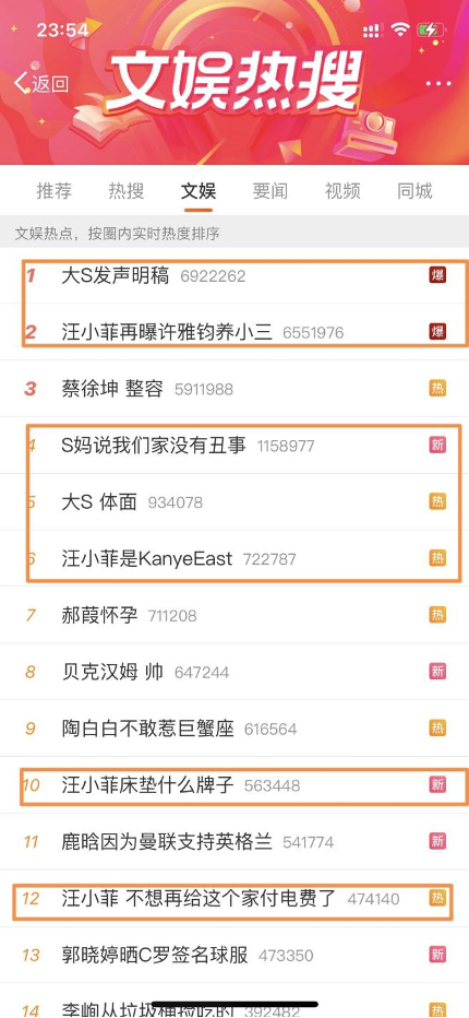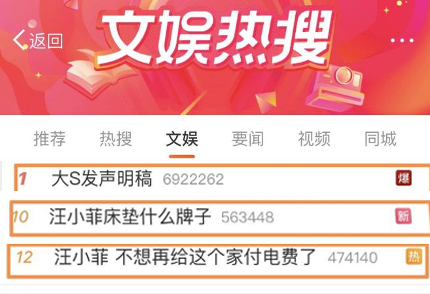 21日傍晚,大S发布声明,称孩子属于共同监护,为保护小孩考虑,希望双方就此停止纷争。然而,双方的争论并未因此平息,汪小菲和母亲张兰、大S和母亲黄春梅(S妈)均卷入该舆论战,在双方你来我往的爆料中,网友们的关注焦点亦不断转移,从“不交电费”到“换床垫”、到汪小菲是否赴台接孩子,再到大S是否婚内出轨……网友们急于探知事件细节,从21日截至财经E法发稿,汪小菲与大S的相关话题仍长踞微博文娱榜榜首。