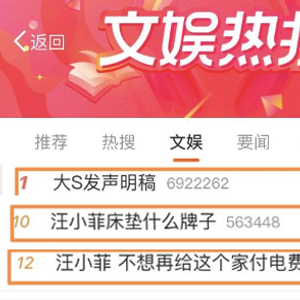 “汪小菲床垫什么牌子”“小菲早啊,上飞机了吗”“大S发声明稿”“S妈说我们家没有丑事”“具俊晔删了18年飞台北的ins”……从11月21日至24日,微博文娱热搜榜几乎被汪小菲和大S的相关话题霸榜。有网友直接在汪小菲微博下留言:“爆料吗?爆一个料我买一个酸辣粉。”该条留言点赞量约1.8万。