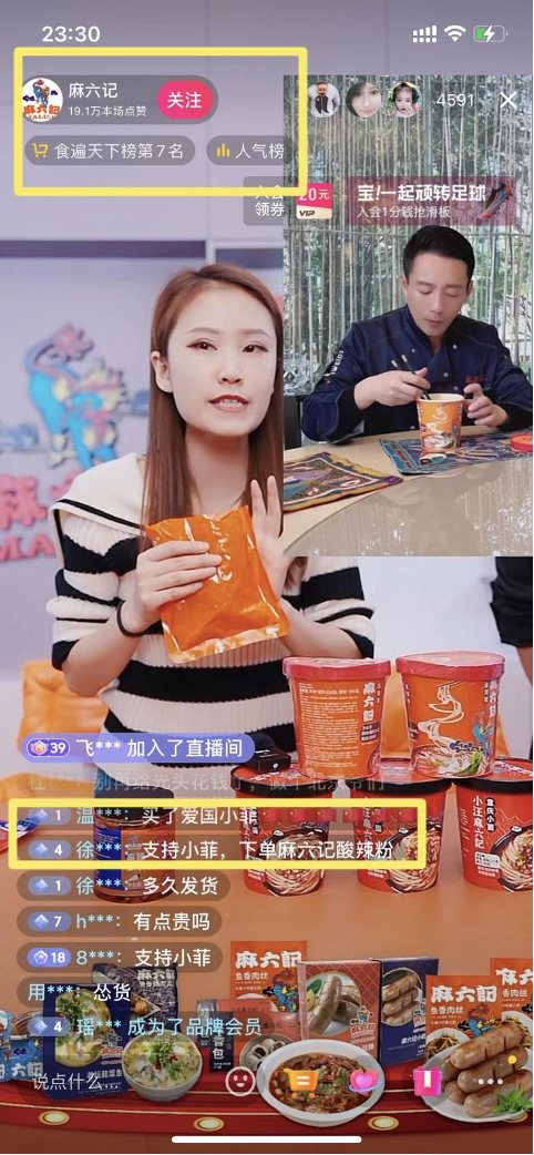 汪小菲所发的金句,不止给“麻六记”赚足了流量,还带火了“麻六记酸辣粉”。枚文(化名)便是在此次事件中得知的“麻六记酸辣粉”。11月21日晚,枚文在“麻六记”直播间下单了5桶酸辣粉,“也是吃瓜后知道了(这个品牌),就下单试试。”枚文向财经E法表示。灰豚数据显示,一桶39.9元的麻六记酸辣粉,在11月23日便卖出了超过20万桶,直播销售额超过400万元,远超20日的5万元的销售额,18日的30万元的销售额。
