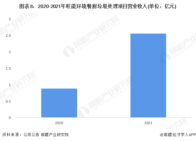 2021年,旺能环境的餐厨垃圾处理业务收入逐年增长。2021年公司餐厨垃圾处理项目收入共计2.56亿元,同比增长189.71%。