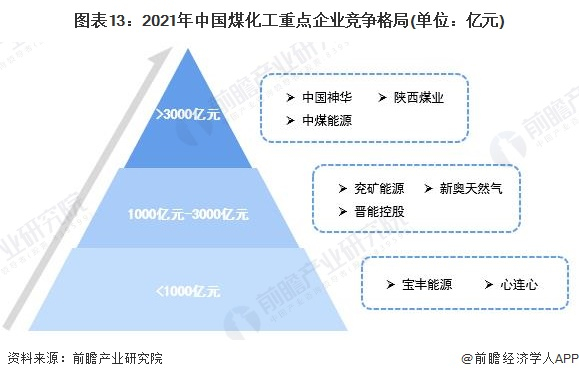 前瞻结合中国煤化工行业主要竞争者已公布的生产经营数据,以及近年来企业生产经营状况,对中国煤化工重点企业竞争格局进行分析:在目前中国煤化工重点企业中,中国神华,中煤能源和陕西煤业三家企业在营业收入、利润总额、资产总额和煤化工产品产能产量方面占据绝对优势,共同组成了中国煤化工行业竞争第一梯队;晋能控股、兖矿能源和新奥天然气等企业营业收入规模均在1000亿元以上,他们经过长期的技术积累,培养出了具有竞争力的煤化工产品及生产研发技术,三家企共同构成中国煤化工行业第二竞争梯队;宝丰能源,心连心等营业收入规模在1000亿元以下的企业领衔中国煤化工行业的第三竞争梯队。