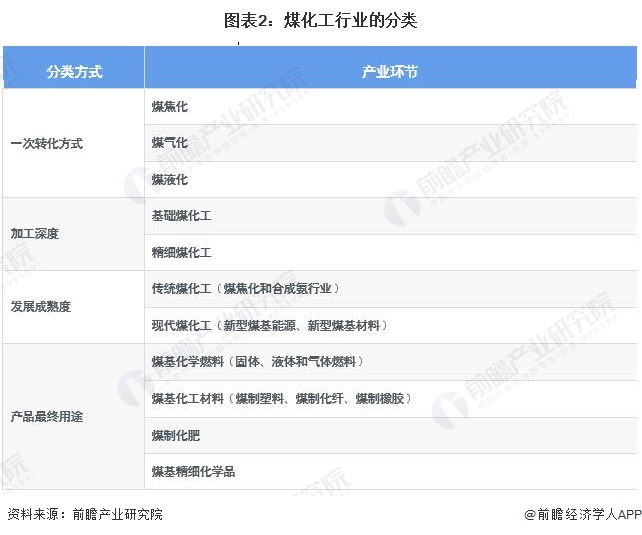 按煤炭的一次转化方式不同,可分为煤焦化、煤气化和煤液化;按加工深度不同,可分为产业链上游的基础煤化工和中下游的精细煤化工。