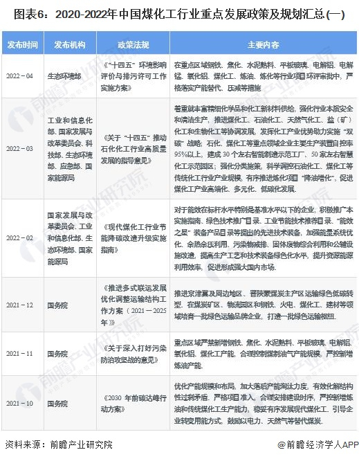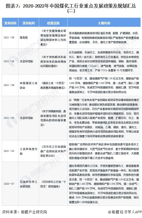 由于煤炭加工会产生大量废水和废气,煤化工一直贴着高能耗、重污染的属性。随着行业技术的进步以及国家政策导向,我国煤化工行业已经逐步向绿色环保、低碳节能的方向发展。从保障能源安全的角度,国家也出台了相应产业扶持政策以指导煤化工行业健康有序发展。2020-2022年中国煤化工行业重点发展政策及规划汇总如下: