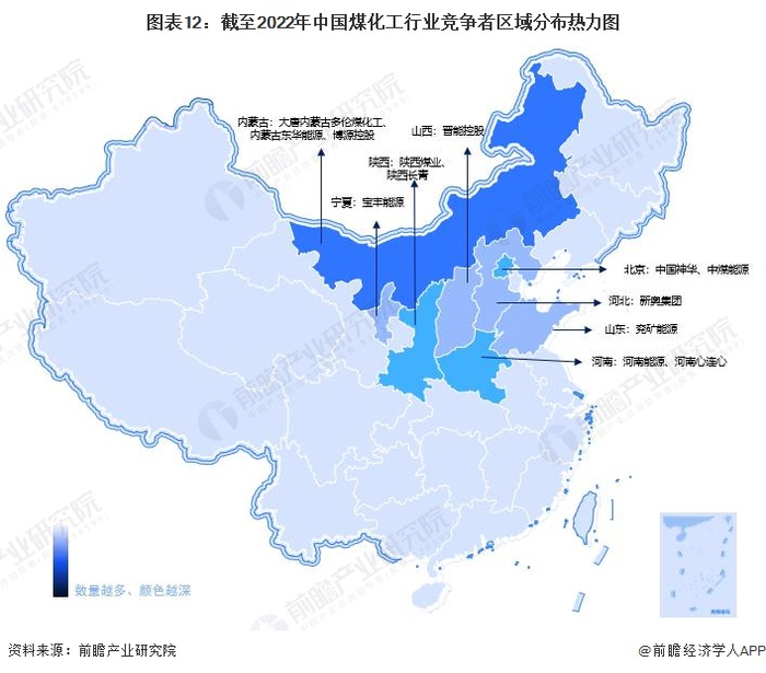 从中国煤化工行业竞争者区域分布情况来看,我国煤化工企业主要集中在内蒙古、北京和河北等华北地区省市。除此之外,宁夏、陕西和河南也有较多煤化工行业竞争者分布,如宝丰能源、陕西煤业和河南能源等。