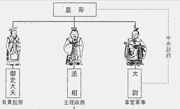 由于秦始皇尤其是其接班人秦二世胡亥的暴政,秦朝建立仅仅15年就被推翻了。秦朝延续了战国时秦国的上计制度,并将其推向统一后的全国。由于15年的历史实在太短,因此史籍中关于上计情况的记载非常少。但我们仍然可以从秦的官制设计和只言片语中找到些蛛丝马迹。秦朝官制中最高级官员是三公,即丞相、太尉、御史大夫。丞相是最高行政长官。《汉书·百官公卿表》说:“掌丞天子,助理万机。”也就是说丞相的职责是按照皇帝的旨意,协助管理国家的政务。秦朝丞相或设一人,或设左、右各一人。丞相的属官有侍中,负责殿中奏事,为首者称仆射。太尉是最高军事长官,主管武官的任免黜陟。御史大夫为丞相之副,一方面供内庭差遣,另一方面又握有监察百官之权。