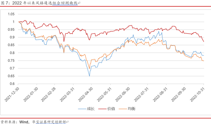首先,从2022年以来根据分类遴选模型进行风格基金组合策略的构建,观察各个风格组合是否与今年市场表现相一致。2022年以来,受到国内多个地区疫情扩散以及海外地缘政治冲突影响,市场表现整体呈现疲软的态势,特别是受到资金追捧的成长股,在去年较大幅度的上涨后,今年年初开始出现回调,1月至5月表现较差;5月份后,在新能源相关板块快速修复的带动下,成长股也迎来了新一轮的投资机会,年初的跌幅得到了很大程度的修复;8月份后,受到国内疫情多地散发、美联储加息影响加剧、海外冲突加剧以及海内外经济表现不及预期等因素的负面影响,导致市场信心不足,市场开始回落,特别是成长风格再次受到较大拖累。