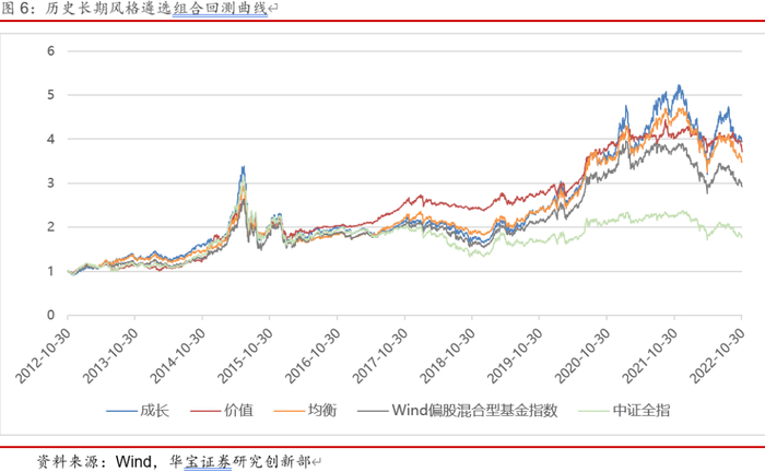 分类筛选策略是每季度根据分类模型对市场上的主动权益型基金进行风格划分(包括华宝证券二级分类中的普通股票型基金、高权益仓位混合型基金以及中高权益仓位混合型基金,剔除行业主题型基金),再根据打分模型在每个风格基金池中遴选一定数量表现较好的基金构成风格组合,当期风格组合中的基金等权配置并持有一个季度,回测时仅考虑A类份额,同时要求基金在调仓时间点上成立满一年且没有暂停申购,基金规模大于5亿元;为加强组合策略反映真实投资情况的效果以及实用性,进行策略组合回测时将季报及本年报公布时间滞后性纳入考虑范围,对于使用到季报公布的重仓股信息数据的指标,指标日期进行延后30天处理,对于使用到半年报和年报的全部持仓股信息数据指标,指标日期进行延后60天的处理。此处主要考察回测区间内不同风格组合之间表现的差异,因此每季度调仓时不考虑交易费用。