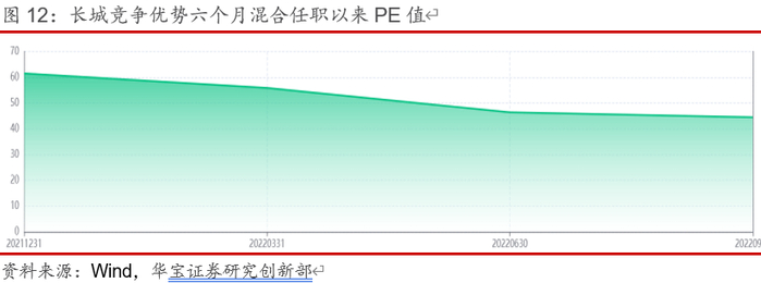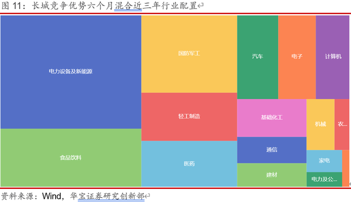 以上为最新一期成长风格遴选回测组合中的基金,以长城竞争优势六个月混合为例进行分析,该基金近三年的全部持仓中,平均持仓比例最高的几个行业主要包括电力设备及新能源、食品饮料以及国防军工,食品饮料行业的配置比例较高主要是因为基金配置了很高比例仓位的高端白酒龙头以及中高端白酒企业,此类标的具有增长较快以及未来增长确定性高的特点,因此市场给予此类标的很高的估值水平,具有成长风格特征;其他高配置比例行业中的汽车和电力设备及新能源行业,均属于新能源相关板块,新能源相关板块处于行业发展初期,未来增长潜力巨大,市场给予相关板块标的很高渗透率和发展空间的期望,估值水平普遍较高,属于典型的成长风格;国防军工属于成长板块代表性行业的新半军中的一个,未来军费投入以及先进装备的发展潜力巨大,具有显著的成长特性;医药板块重要集中在医疗器械及药物创新领域,同样具有显著的成长特性。过去三年中,本只基金公布的全部持仓中前三大重仓行业主要集中在食品饮料、国防军工和和新能源相关板块,风格稳定性较高,总体风格特征符合本文对成长风格基金遴选的要求。
