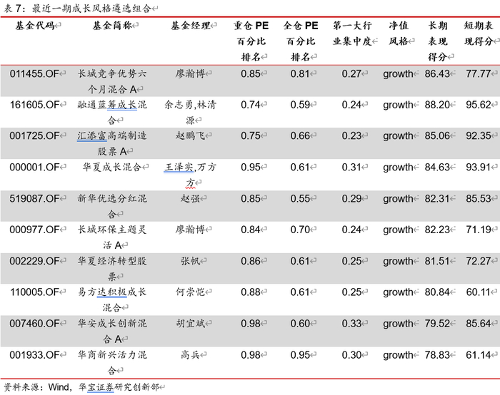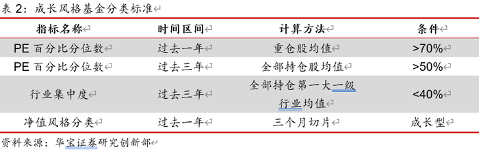 成长型与价值型基金的分类方法类似,首先都要通过净值回归模型找到在表现上具有成长风格特征的基金。再从持仓的估值维度来做限制,找到在净值表现上偏成长,同时持仓上也偏成长的基金。