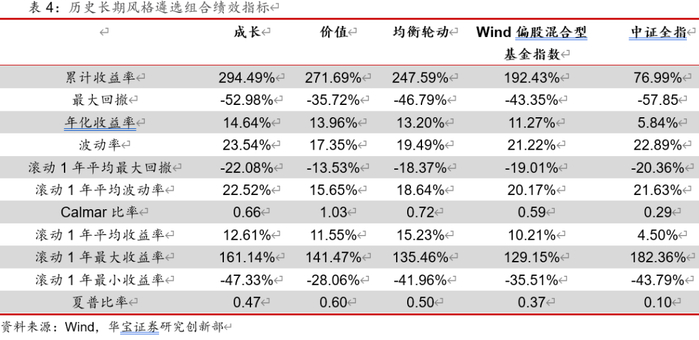 在衡量打分模型对于基金筛选的效果方面,选取万得偏股混合型基金指数和中证全指作为比较基准,从图中组合曲线可以看出,价值、成长和均衡轮动三个风格曲线基本上均可以保持跑赢基准曲线,价值型组合在2016年后保持显著超额收益,成长和均衡轮动型组合在2020年后的上涨行情中也能够快速拉大超额收益水平,组合表现优秀。价值型组合的各项长期业绩指标均优于万得偏股混合型基金指数,在保持优秀的波动和回撤控制能力的同时,能够获得较高的长期投资收益;成长型组合近十年的收益率远高于混合型基金基准,但是在回撤和波动上逊色于基准,最终依旧可以保持更高的夏普比率。