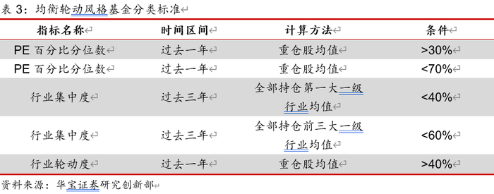 本文想要得到的均衡轮动型基金是可以将中观研判交付给基金经理的这一类基金,因此需要他们不是存粹的价值或成长型基金,而是在行业上有一定分散性,同时会自主做一些板块的研判与偏向。体现在指标上,则在剔除了前文的价值与成长型基金后,持仓上需要估值水平介于价值风格和成长风格基金之间。在行业配置上,则需要具有行业配置分散化的特征,据此,我们在估值水平限制的基础之上加入了行业集中度的要求,需要满足全部持仓中前三大一级行业占比较低的条件;同时进一步加入全部持仓第一大行业的限制条件来剔除行业主题基金。最后,由于每个行业的风格特征会随着宏观经济环境以及行业发展进程发生较大变化,我们对均衡型基金也提出了需要及时进行行业轮动的要求,因此在上述两个限制条件之外,加入了行业轮动度的要求,基金需要满足近一年行业轮动度均值大于设定的阈值。