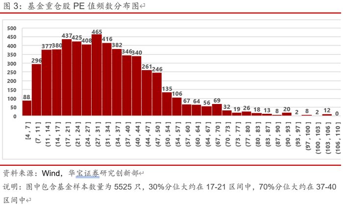 本文使用基金PE衡量估值水平,计算方法是使用全部持仓或者重仓股的个股PE值,通过加权平均的方法求得。