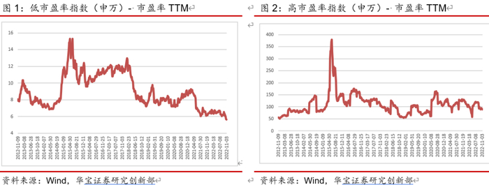 考虑到个股PE受到市场整体表现的影响较大,历史上不同时期的PE值分布会有较大差异,使用PE绝对值作为筛选条件的合理性欠佳。以近十年申万低市盈率指数为例(如图1曲线所示),从指数的市盈率TTM中可以看出,近十年市盈率水平有较大的波动,2015年至2018年市盈率水平较高,最高达到15.29,近一年市盈率水平较低,保持在6附近的水平;申万高市盈率指数同样表现出的波动特征(如图2曲线所示),近十年中,2015年期间出现较大波动,市盈率水平超过300,最近市盈率水平低于100。综上,如果在不同历史时期使用固定的PE值,会导致筛选结果发生较大的风格偏移,可能无法获取需求风格特征的基金。