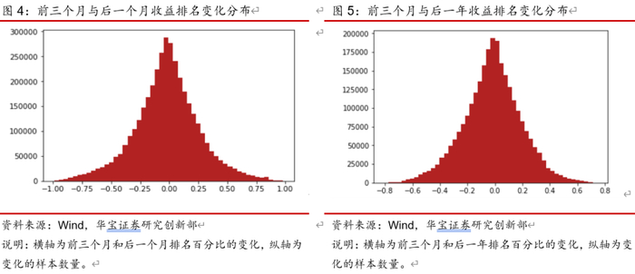 在实际基金投资中,投资者同样会加入对短期绩效的考量,投资者将资产配置在近期表现相对于同类较差的基金中的可能性较小,更愿意选择不论是长期还是近期在同类别中均表现优异的基金;本文也对基金短期绩效的延续性进行了简单的阐述,根据所有权益型基金近五年的净值数据,计算历史上滚动一个月、三个月及一年的收益率数据,样本包含了过去五年中每一天的前后一定时间长度内的收益率。从下图的排名变化频数分布图中可以看出,基金过去三个月同类别排名与未来一个月同类别排名的变化主要分布在0附近,排名能够提升25%的概率已经达到较低水平,这说明基金近期短时间内表现与未来一段时间的收益表现有较强的相关性;将未来表现的观测时间拉长至一年,排名变化大小进一步朝着0附近聚集,过去三个月的收益率排名能够在未来一年的收益率排名中得到较大幅度提升的概率进一步缩小。