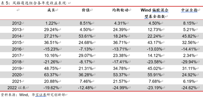 根据历史长期和特定时间段内的风格基金组合的策略回测结果,价值、成长和均衡轮动风格基金组合呈现出显著的差异且符合相应的风格表现特征,验证了本文的风格分类模型可以构建具有显著风格特征的基金池。使用本文打分模型筛选出的风格组合,长期上可以在各项绩效指标上战胜混合基金指数,验证了本文打分模型具有较好的筛选效果。