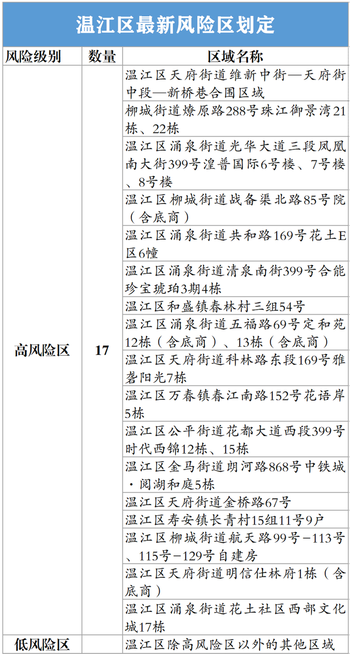 一、(1)自2022年11月24日起,将温江区公平街道长安路181号杨柳小区3幢的风险等级由高风险调整为低风险。(2)自2022年11月25日起,将温江区涌泉街道江浦路2666号金河谷二期25栋,温江区天府街道学海路88号中铁丽景书香1栋,温江区万春镇团结渠路长石社区11栋、12栋、13栋的风险等级由高风险调整为低风险。