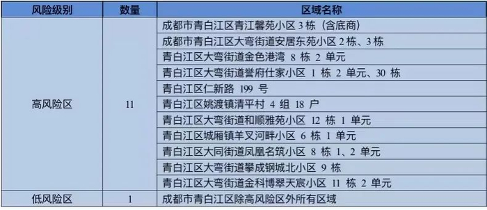 根据国务院应对新型冠状病毒肺炎疫情联防联控机制综合组《新型冠状病毒肺炎防控方案(第九版)》《关于进一步优化新冠肺炎疫情防控措施科学精准做好防控工作的通知》相关规定和专家组综合评估,经成都高新区新冠肺炎疫情防控指挥部研究,调整以下区域风险等级。