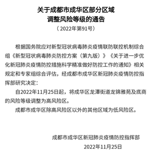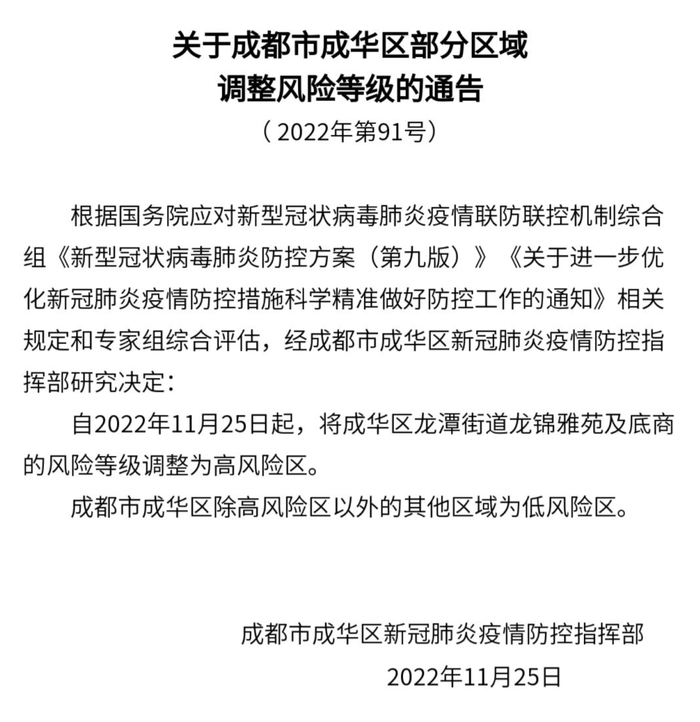 自2022年11月25日10时起,将成都高新区中和街道锦龙云府12栋由高风险区调整为低风险区。