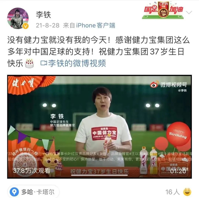 据了解,健力宝是与李铁结缘最久的,双方的关联可以追溯到1993年的“健力宝青年队”。这也成为后来,健力宝与李铁进一步代言合作的“纽带”。2020年8月,升任国家队主帅的李铁再次造访健力宝。随后,变身健力宝品牌星推官、推出了一款健力宝×李铁联名罐,李铁与健力宝之间的合作关系越来越紧密。