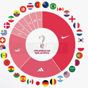 如下图所示,在本届世界杯上,耐克签约的参赛国家队依然最多,总计达到了13支球队,分别是:澳大利亚队、巴西队、加拿大队、克罗地亚队、英格兰队、法国队、荷兰队、韩国队、波兰队、葡萄牙队、卡塔尔队、沙特队、美国队。