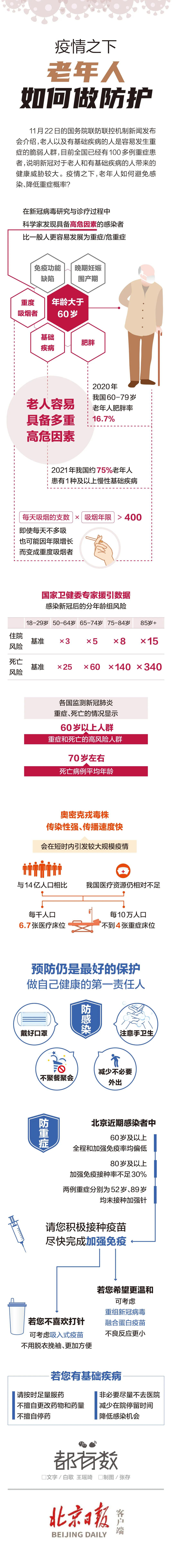 11月22日的国务院联防联控机制新闻发布会介绍,老人以及有基础疾病的人是容易发生重症的脆弱人群,目前全国已经有100多例重症患者,说明新冠对于老人和有基础疾病的人带来的健康威胁较大。