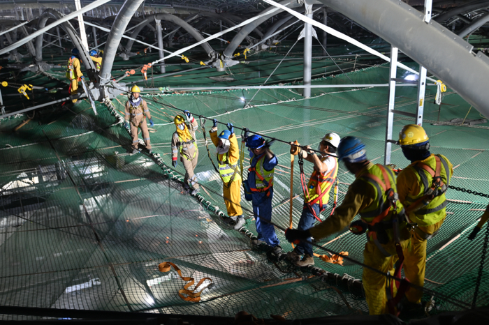值得一提的是,此次建造团队还创新地把安全网充分利用起来,采用先进技术把安全网“绷直”成为操作平台,成功解决了工人在70米高空作业的安全问题,让施工更加高效。