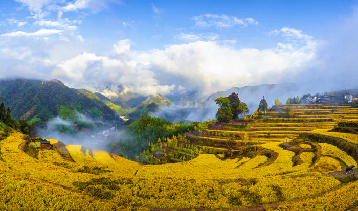 指南村位于太湖源头的南苕溪之滨,是一座有着千年历史的古村。每年秋季,村子两侧470余亩梯田一片金黄。枫香、银杏、天目铁木等珍稀古树,耸立在院前屋后,整个村子颇有宁静隽永的韵味。