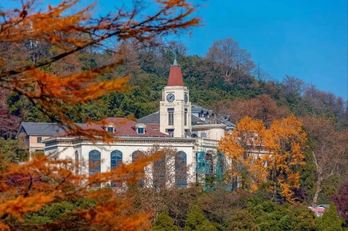 秋天一到,莫干山里的枫叶、银杏、绿竹、松树、水杉,互相搭配出色彩绚丽的风景。两株500岁的枫树红似烈火,与周围的万国建筑相互映衬,赋予了秋日别样的浪漫与静谧。
