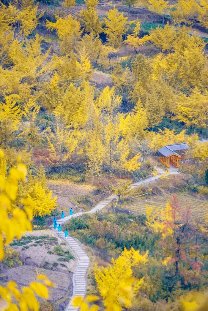 在3万余棵原生银杏的陪伴下,十里银杏长廊一路都盛满了秋天的韶光。从潘礼南村开始,中途经过方岩村、方一村、大岕口,到柏家村,大大小小的银杏树将本是绿褐色的山头和农舍点缀得色彩纷呈。